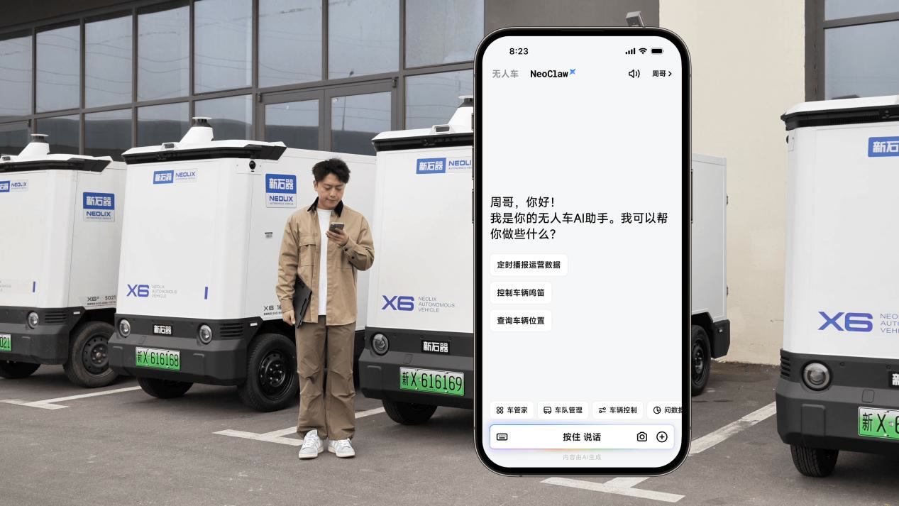 NeoClaw则瞄准了这一行业痛点。“把附近快没电的车都开去充电”“把这50辆车的车门都打开”——在无人车管理APP“新石器准时达”中,运营人员可以像发微信语音一样对NeoClaw下达指令,系统会理解指令、检查车辆状态,然后自动批量执行。与市面上常见的对话式AI不同,NeoClaw的独特之处在于能“动手”:它不只是回答问题或生成文本,而是能够指挥真实的无人车去执行物理任务。目前,NeoClaw已在青岛等地的部分区域率先上线,后续将覆盖更多地区。